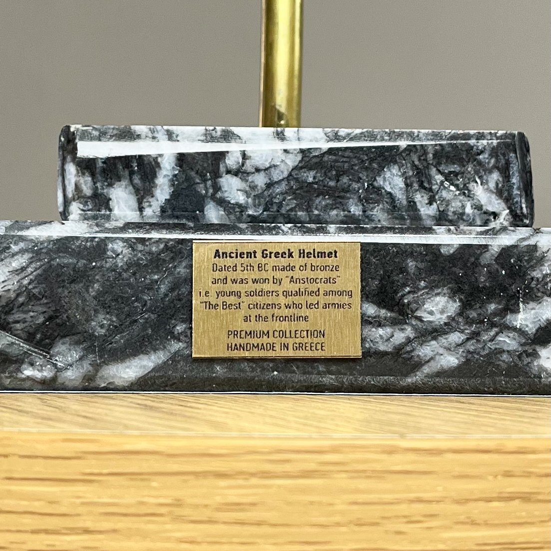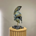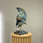 Hand made bronze Ancient Greek Helmet in aged green patina on a black textured marble base.
