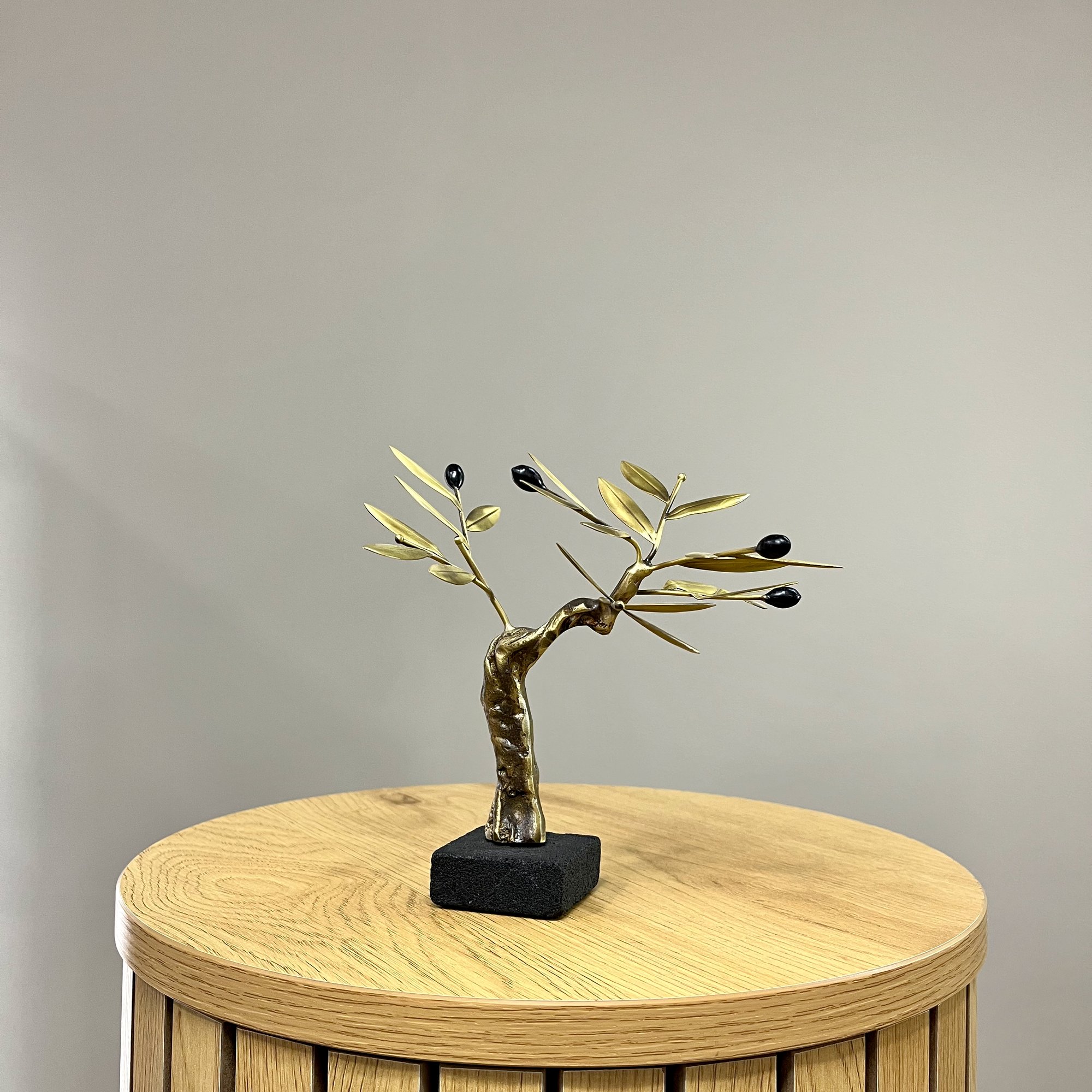 Hand made bronze olive tree with patina on a black volcanic stone.