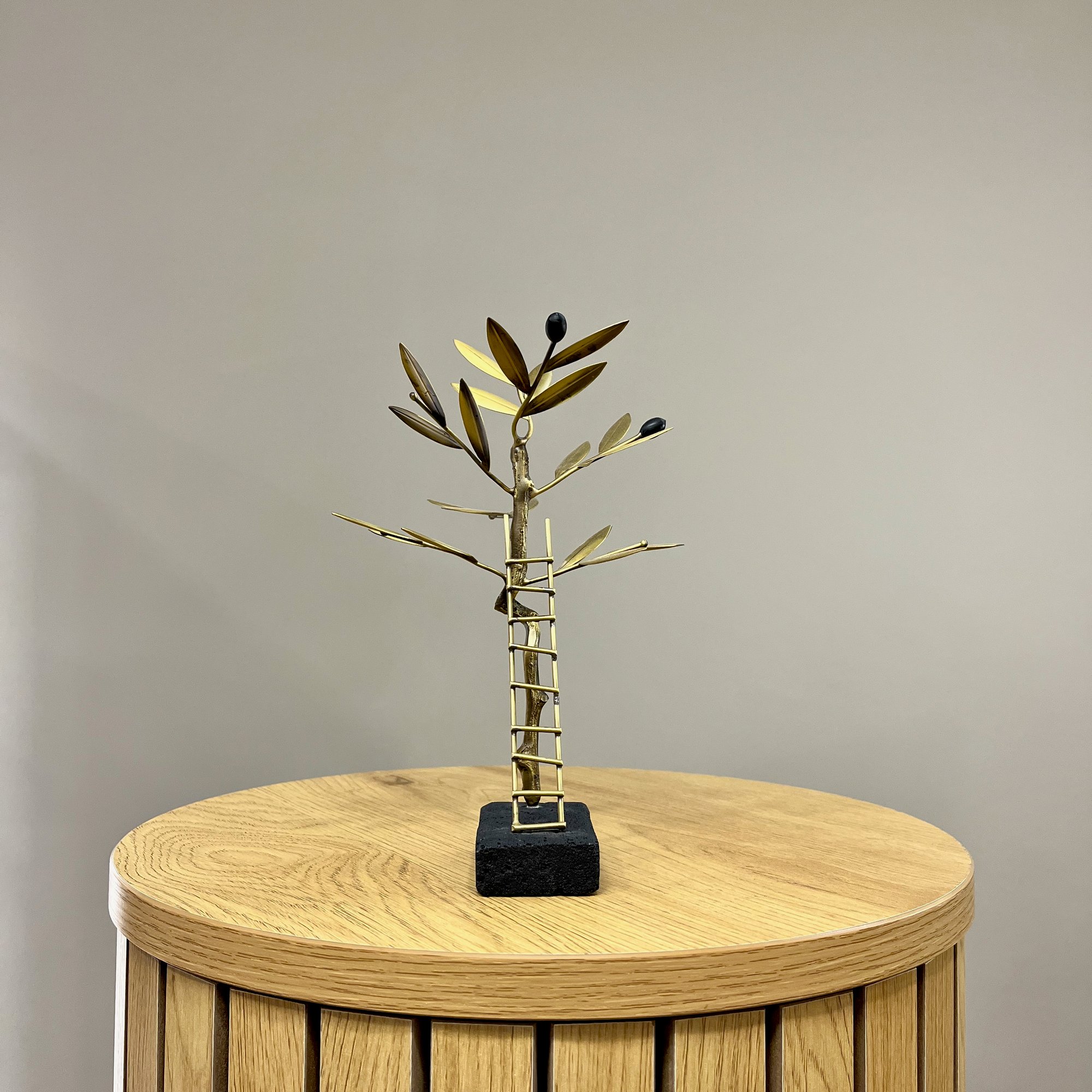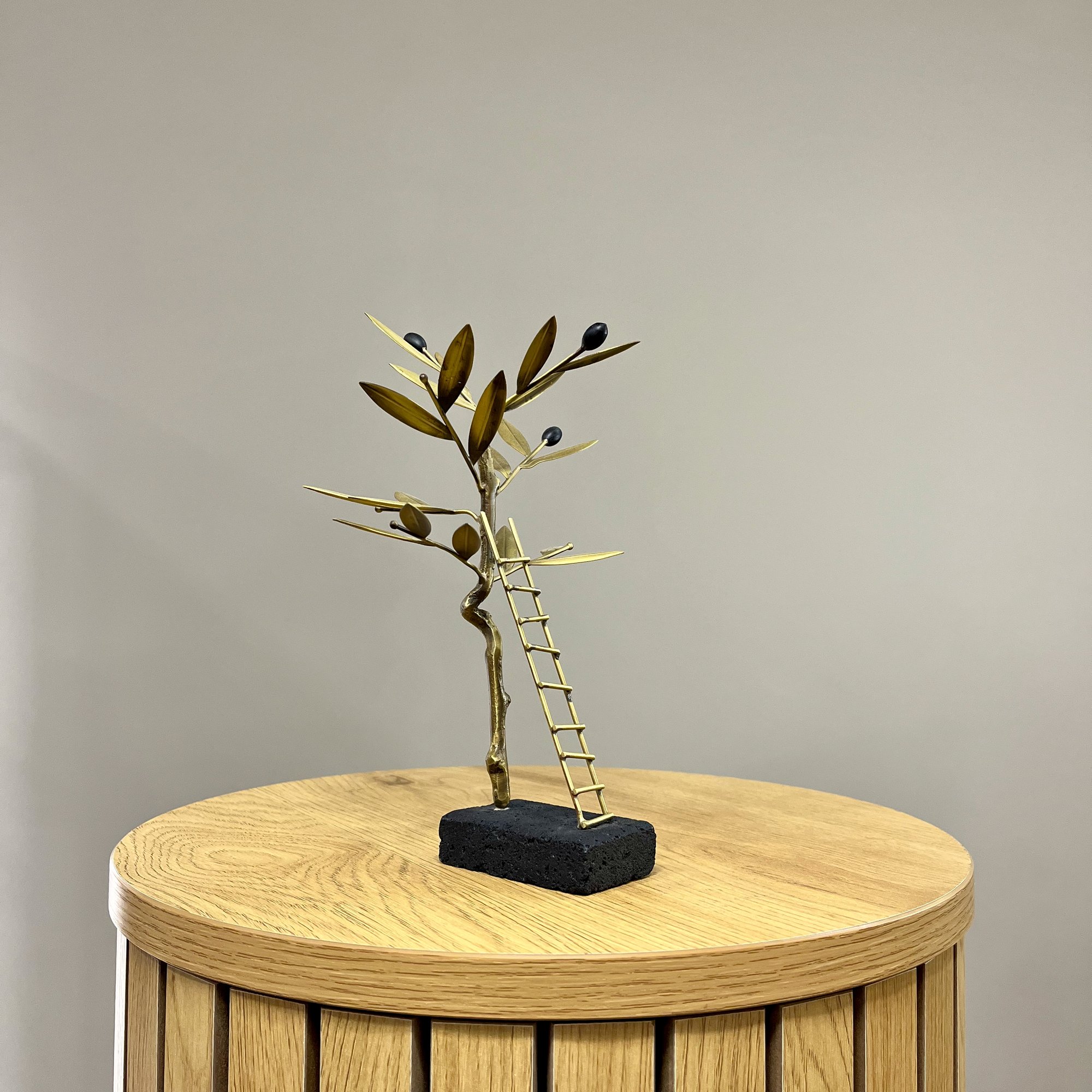 Hand made bronze olive tree with a ladder on a black volcanic stone.