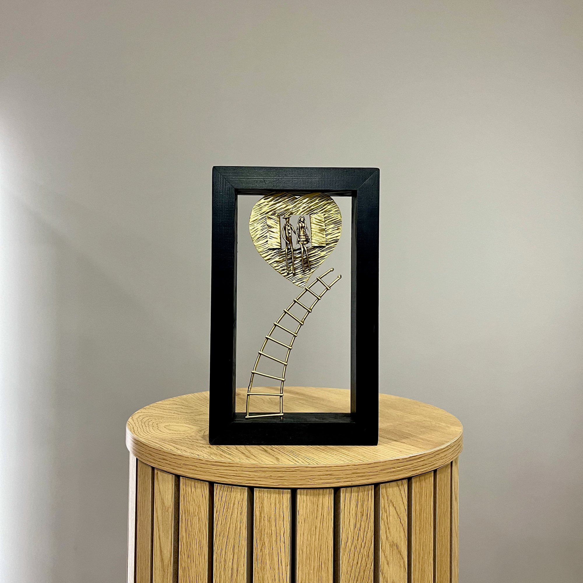 Hand made bronze artwork showing a couple sitting in a heart over a stairwell, in a wooden frame 25x15cm.