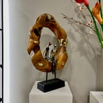 Hand made bronze couple pictured sitting in an irregular aged wooden gold detailed circle, on black wooden base.