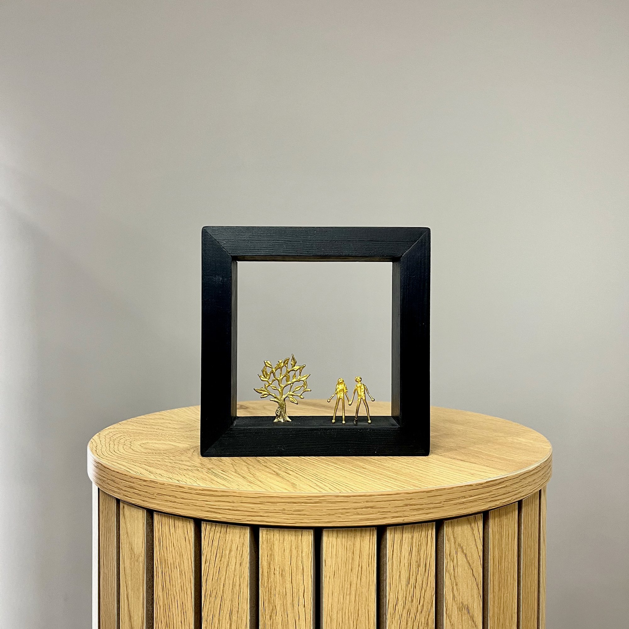 Hand made bronze artwork showing a couple next to an olive tree, in a wooden frame 15x15cm.