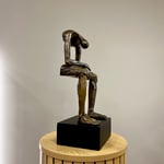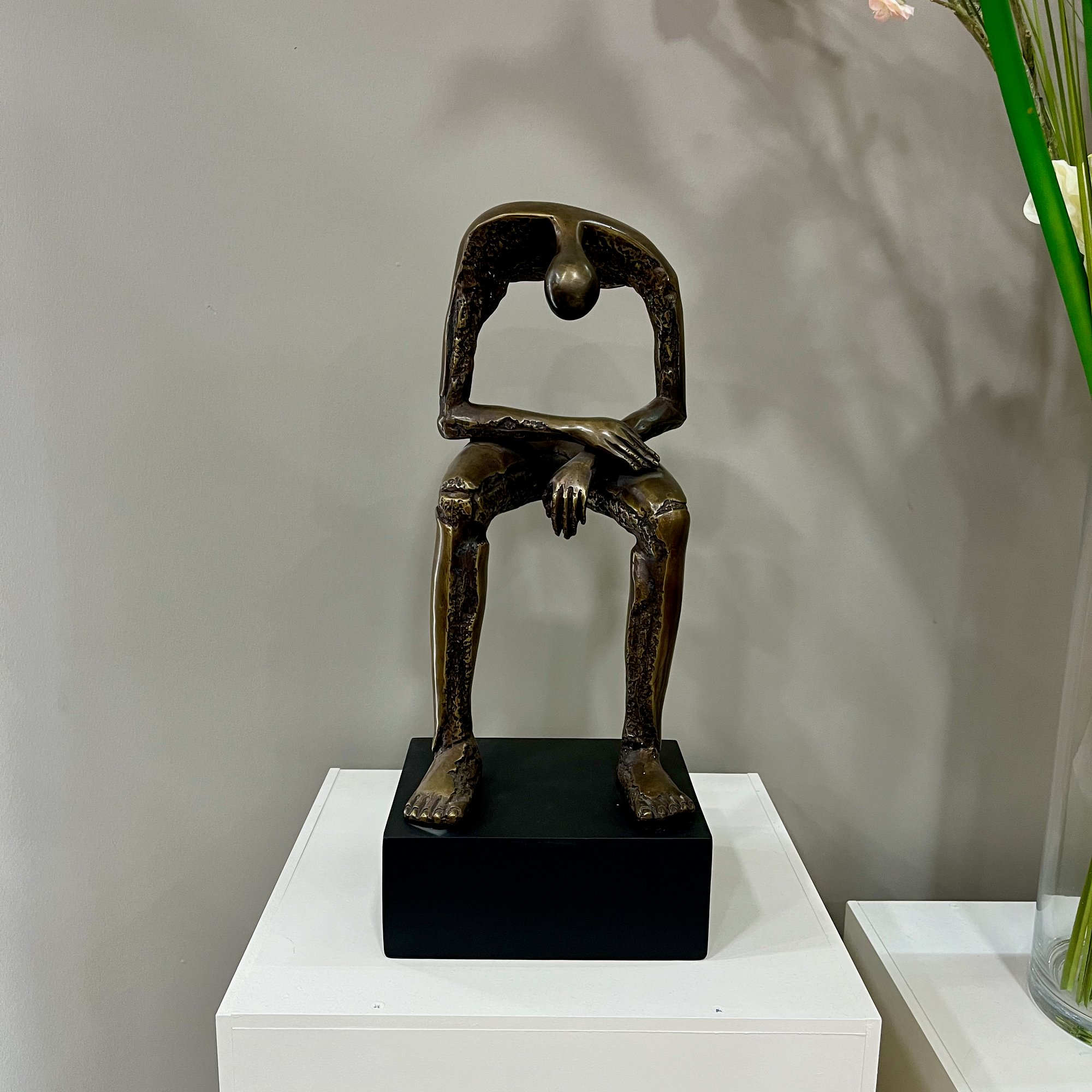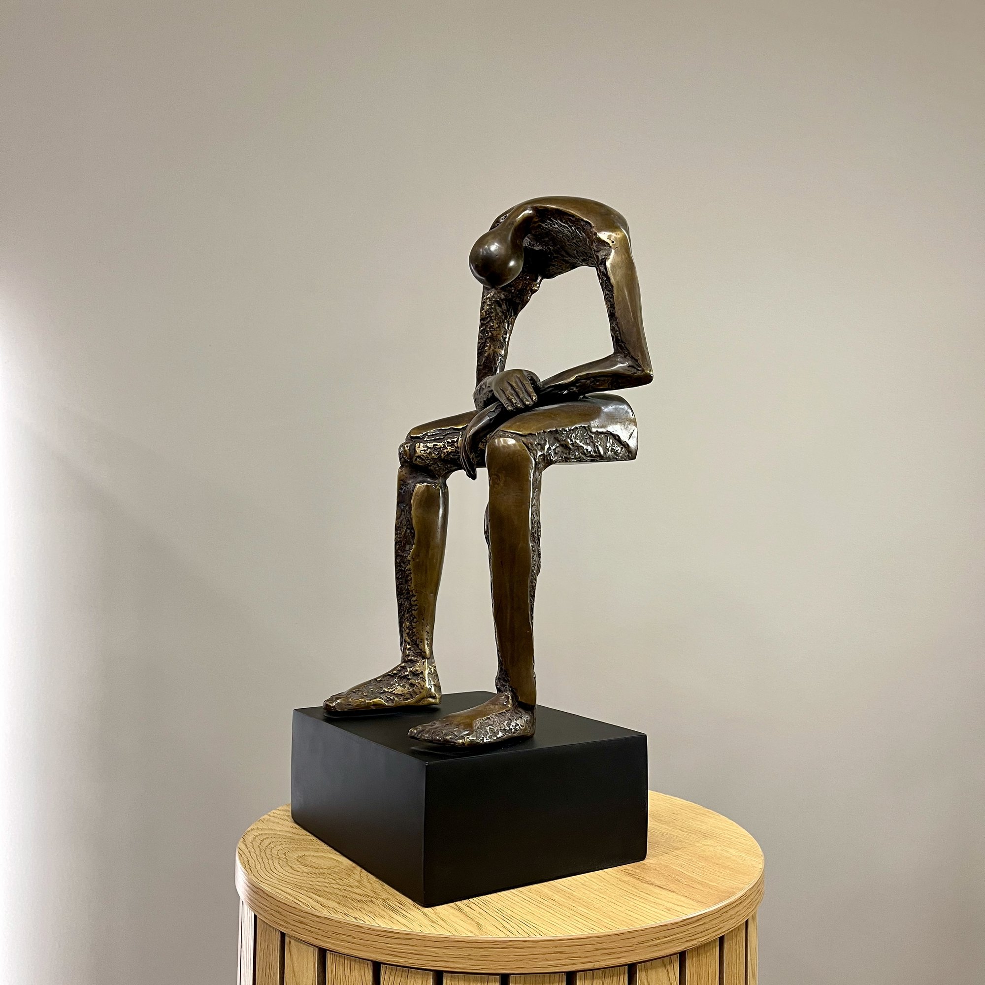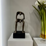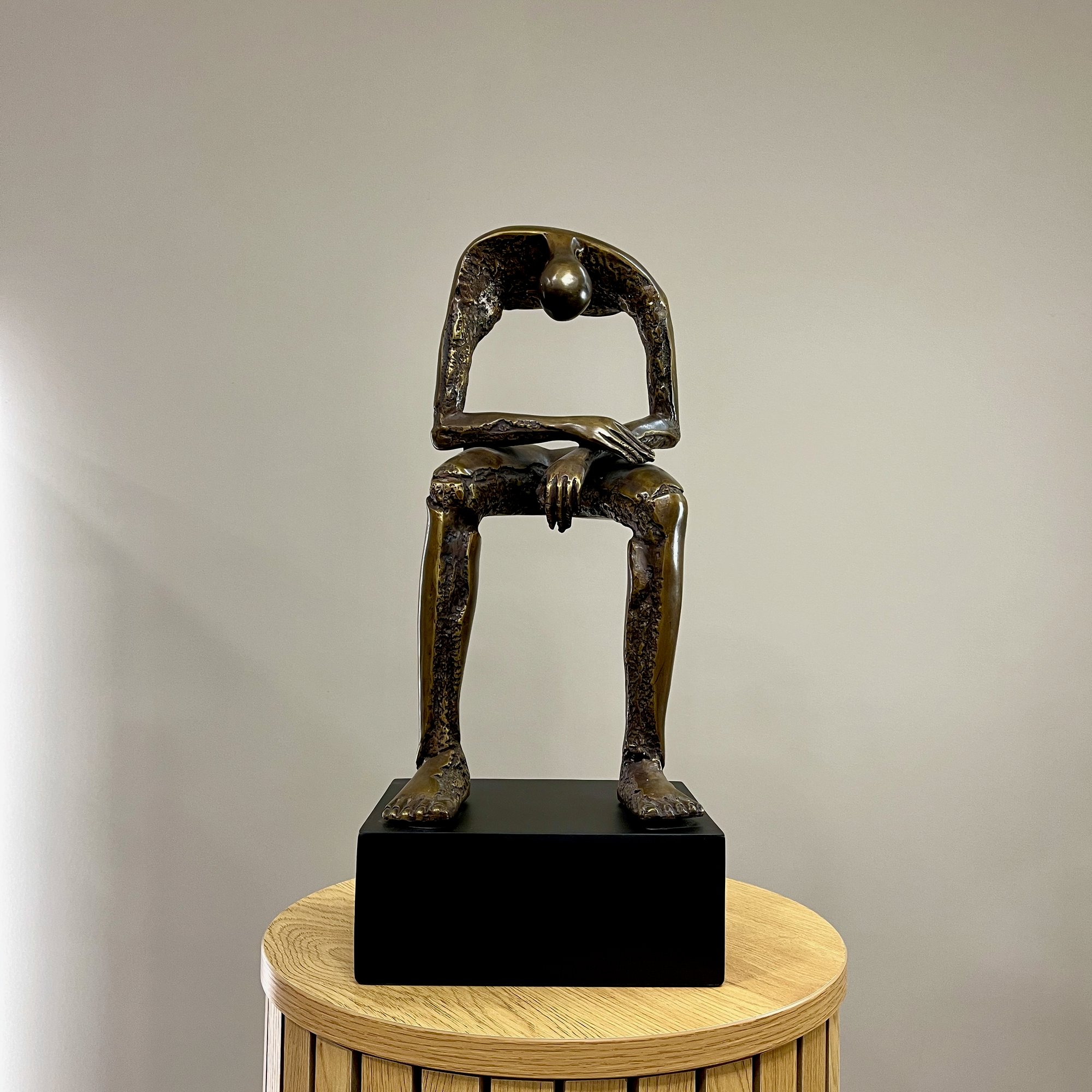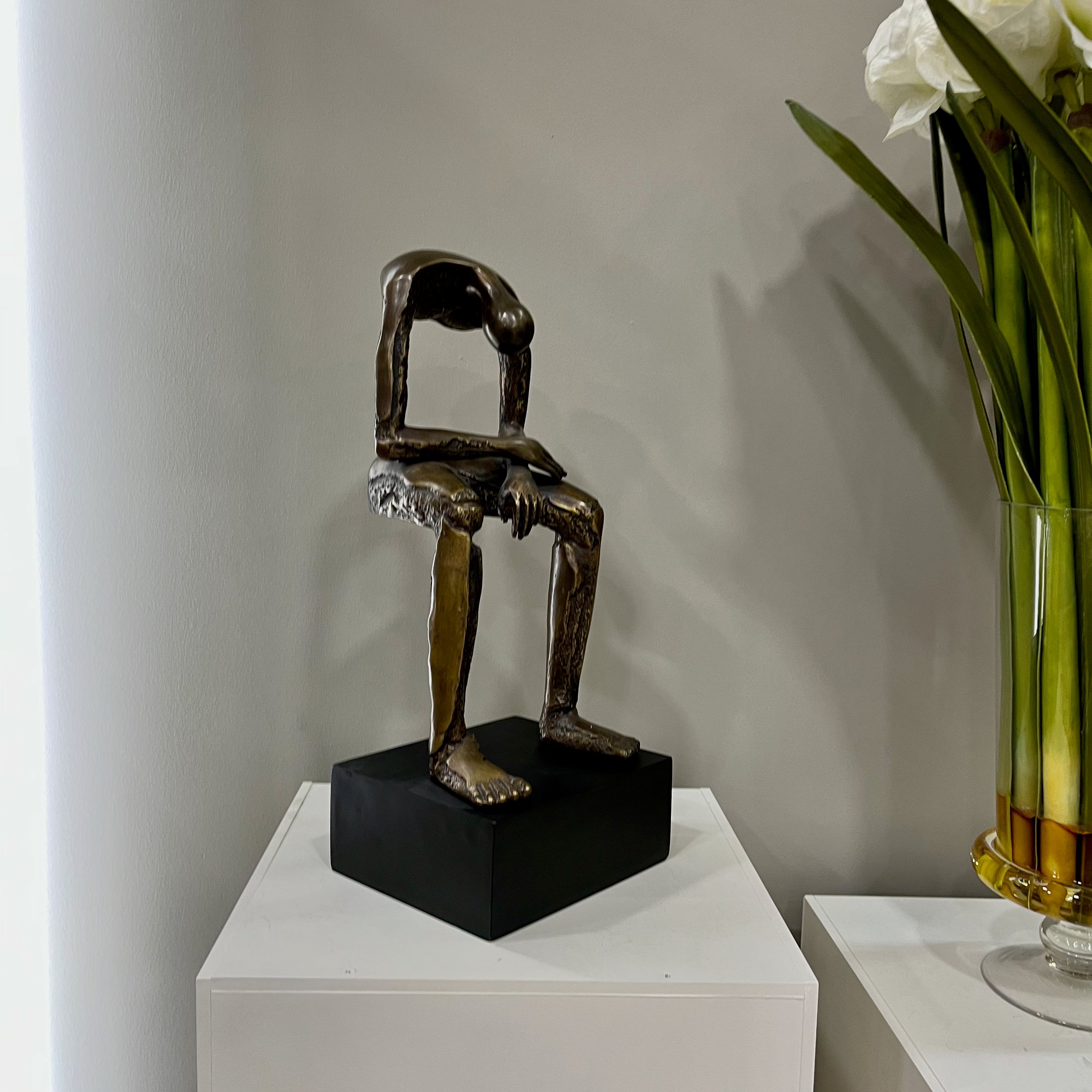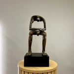 Hand made bronze subtractive artwork in dark brown patina on a black wooden base.