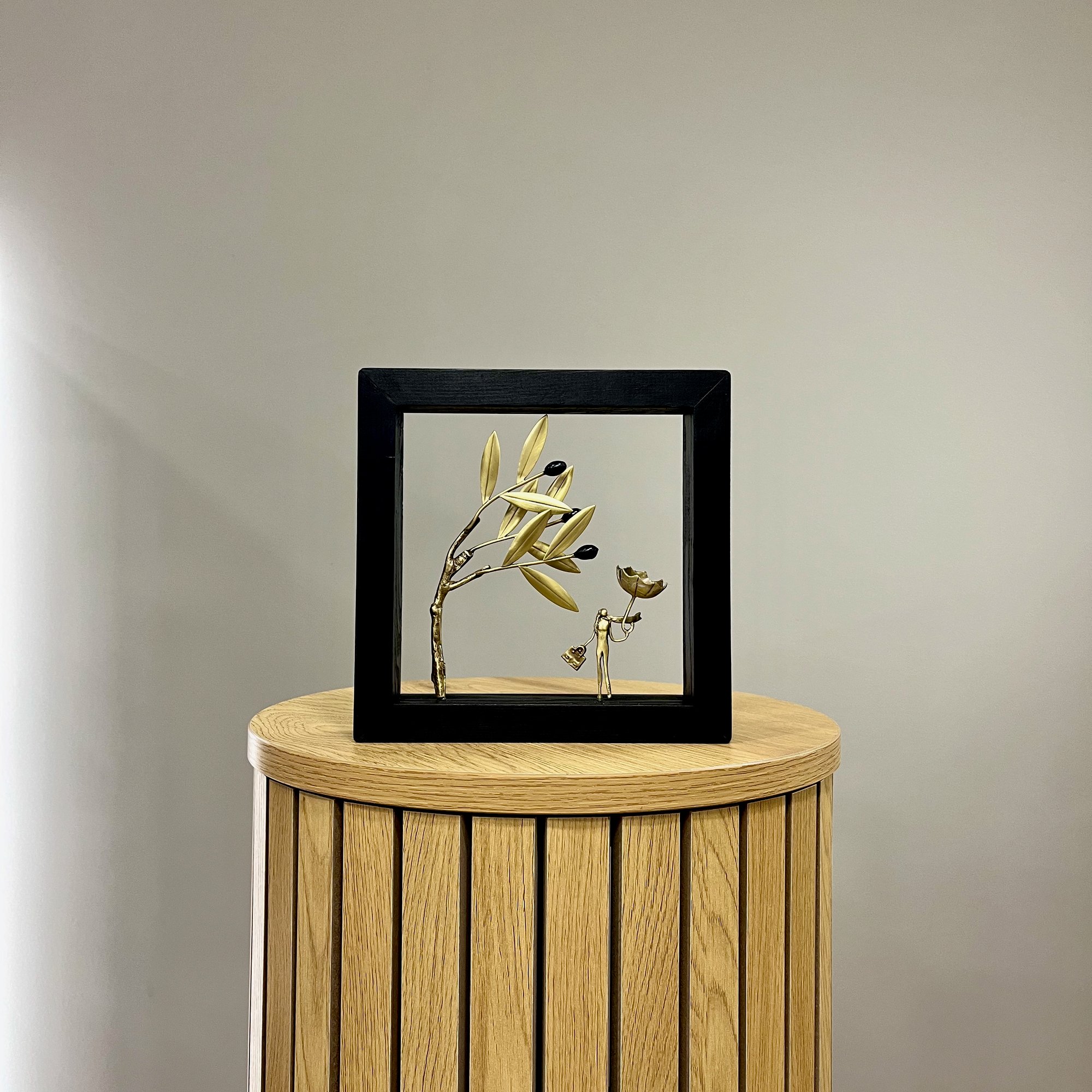 Hand made bronze artwork showing an olive tree and a lady holding an umbrella, in a wooden frame 20x20cm.