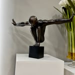 Hand made bronze artwork in dark brown patina on a black wooden base.