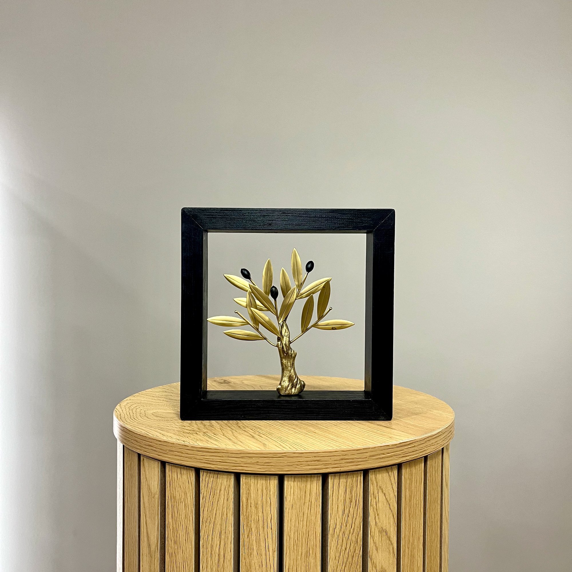 Hand made bronze olive tree in a wooden frame 20x20cm.