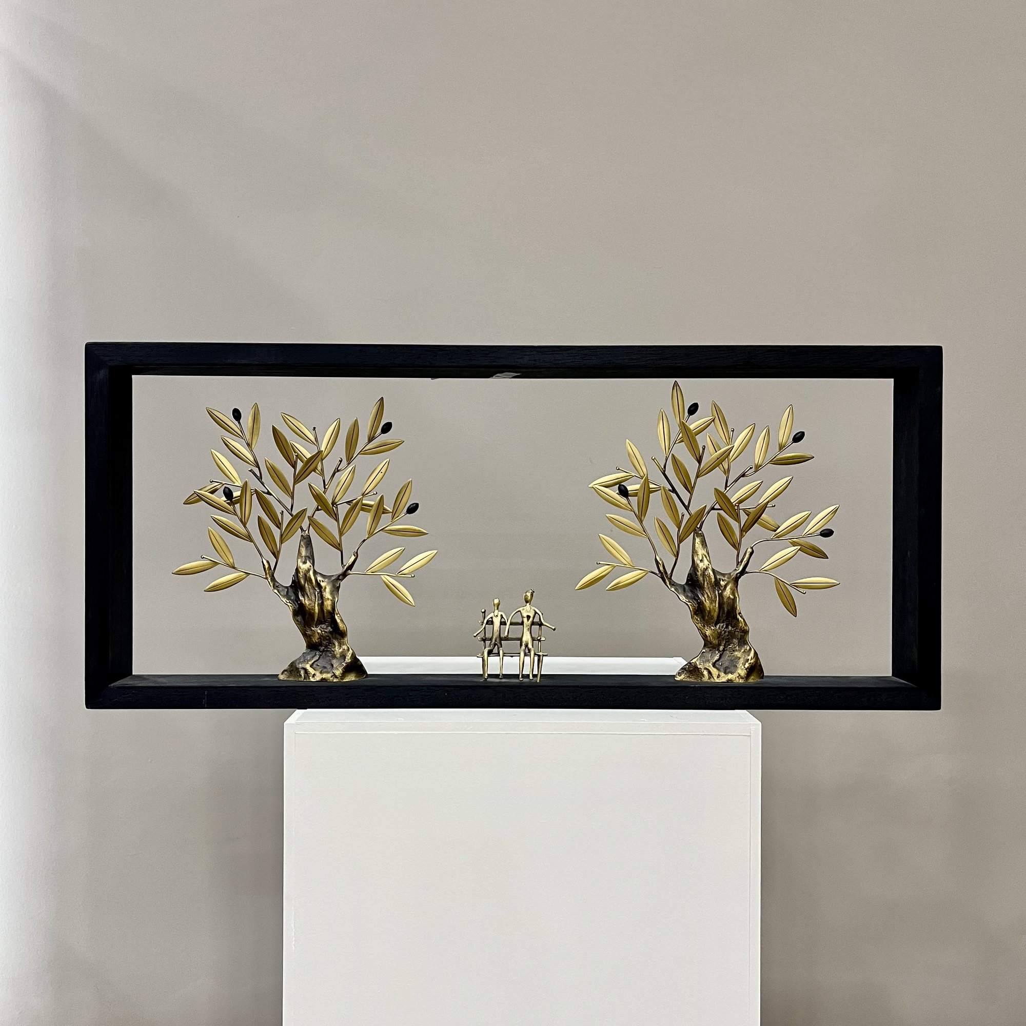 Hand made bronze olive trees & a sitting couple in a wooden frame 70x30cm.