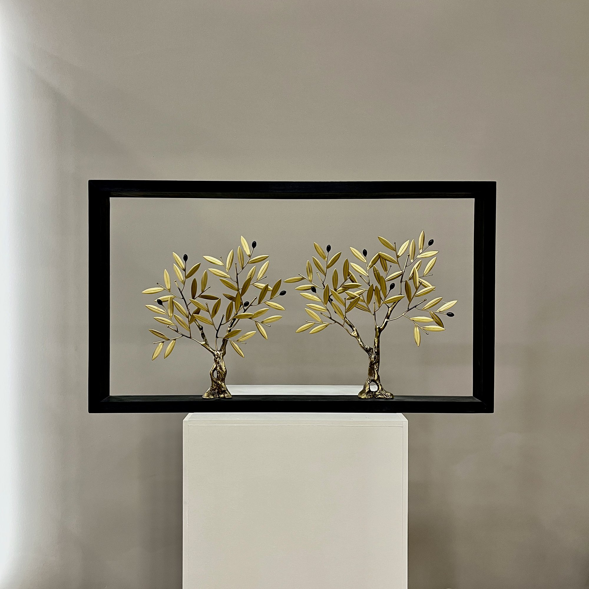 Hand made bronze olive trees in a wooden frame 40x70cm.