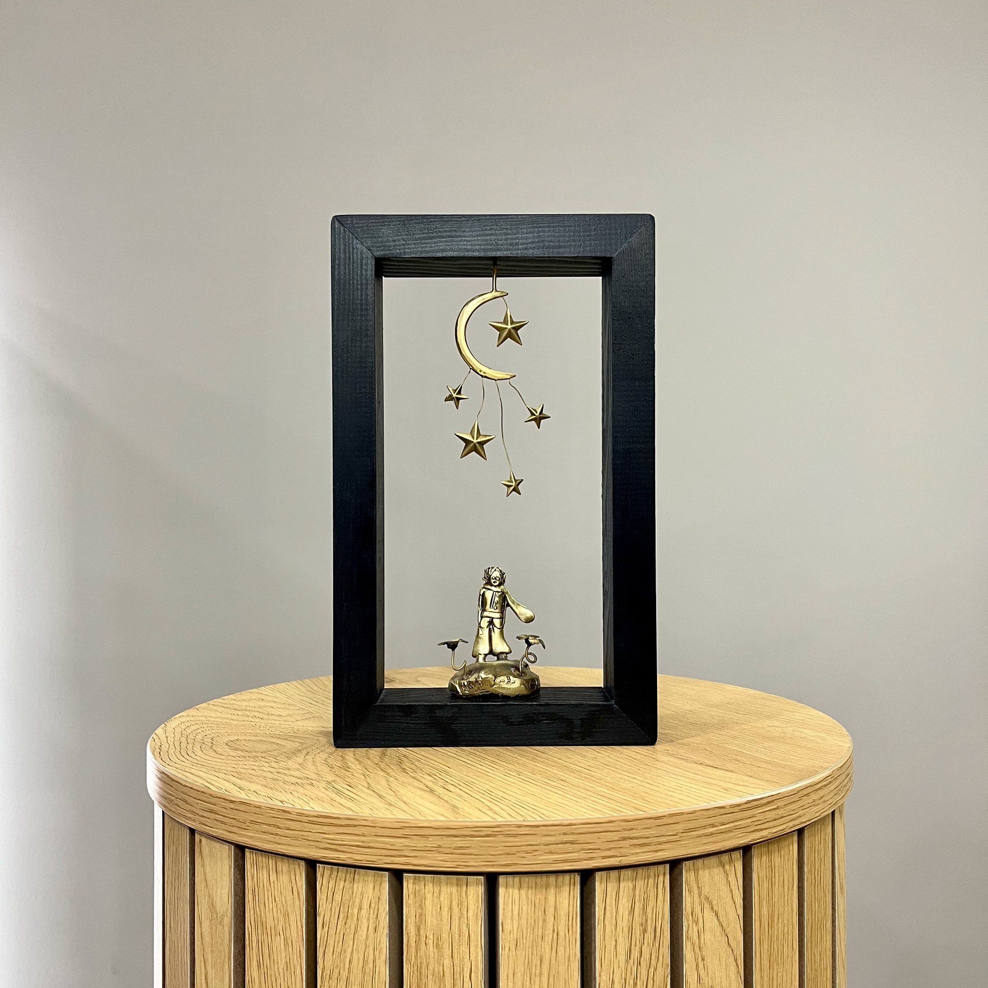 Hand made bronze artwork showing "The Little Prince", in a wooden frame 25x15cm.