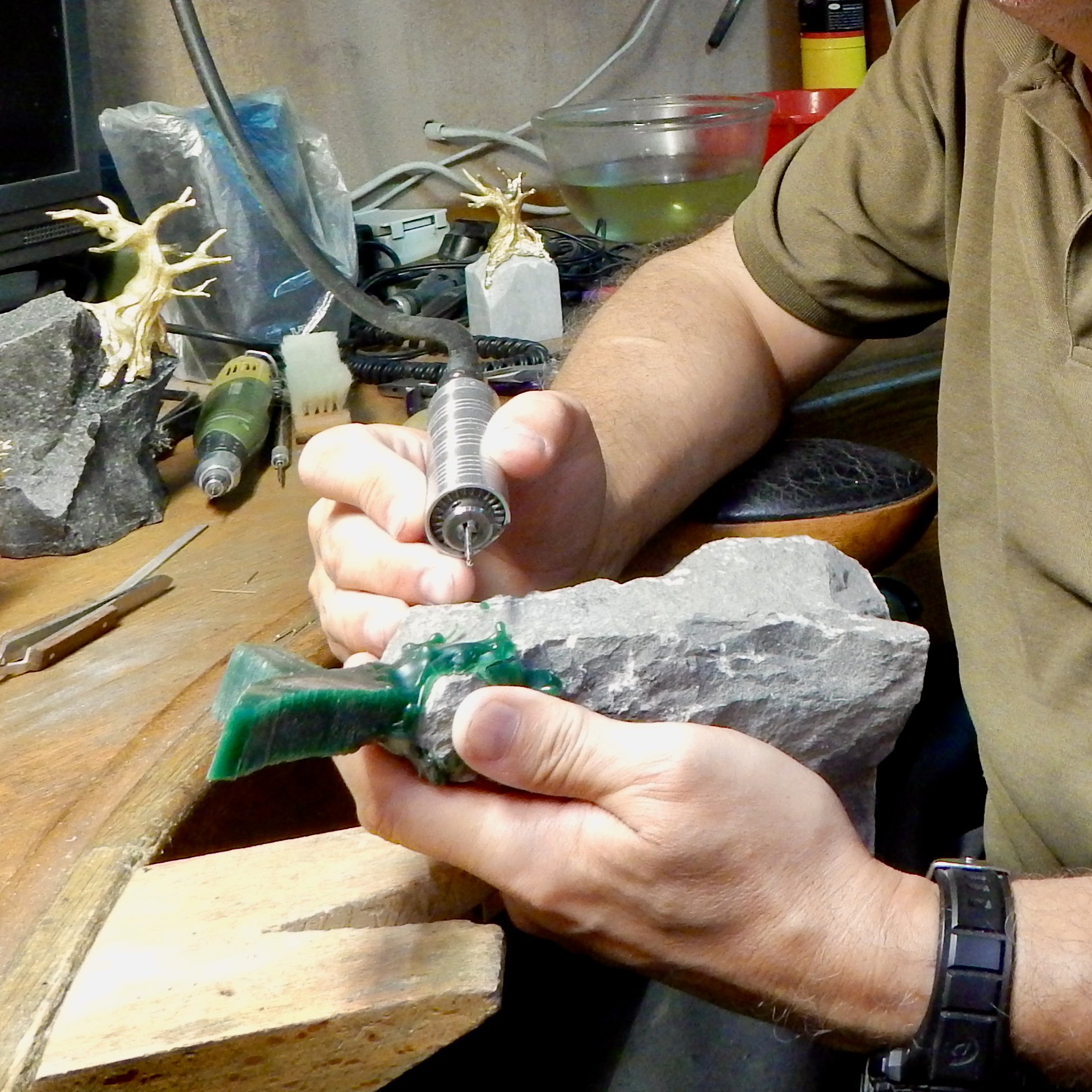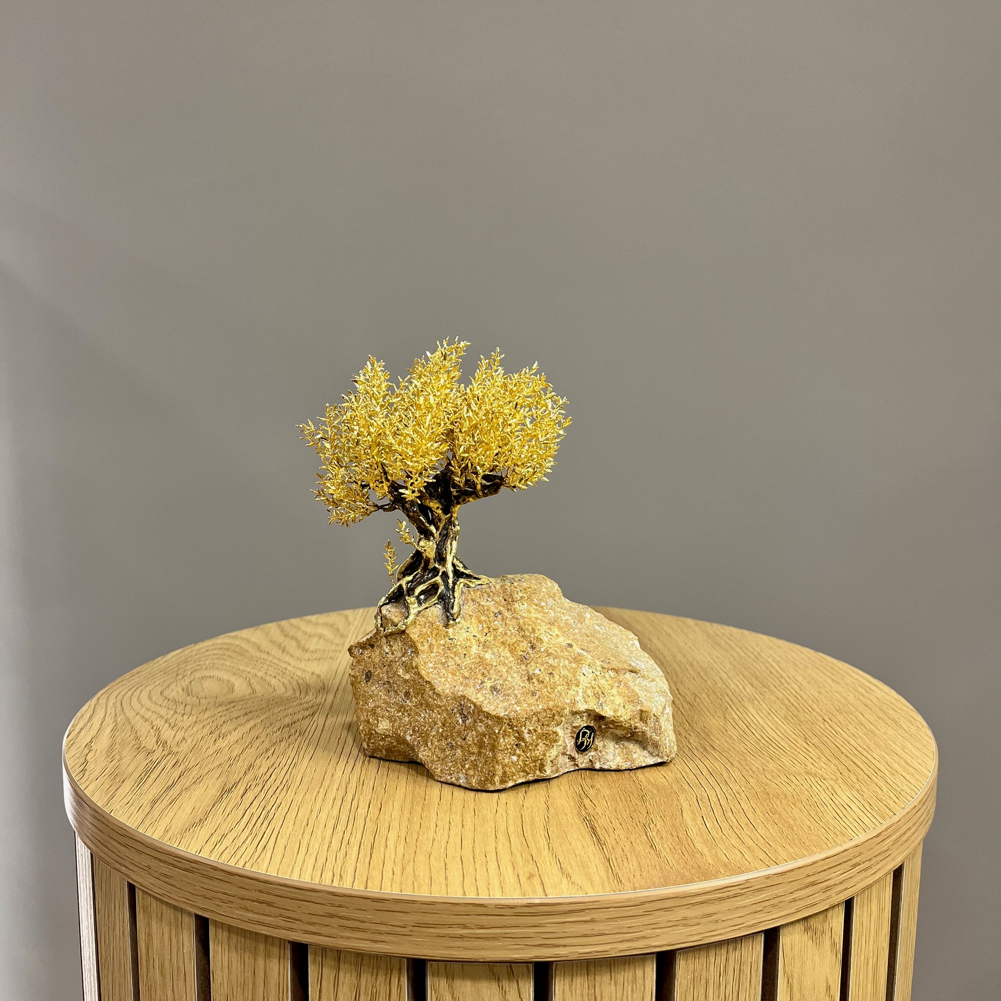 Elaborate hand made tree MicroSculpture, from bronze with 24K Gold plating on an irregular hand carved beige marble base. It comes boxed in a special wooden case with screws for safe transportation.